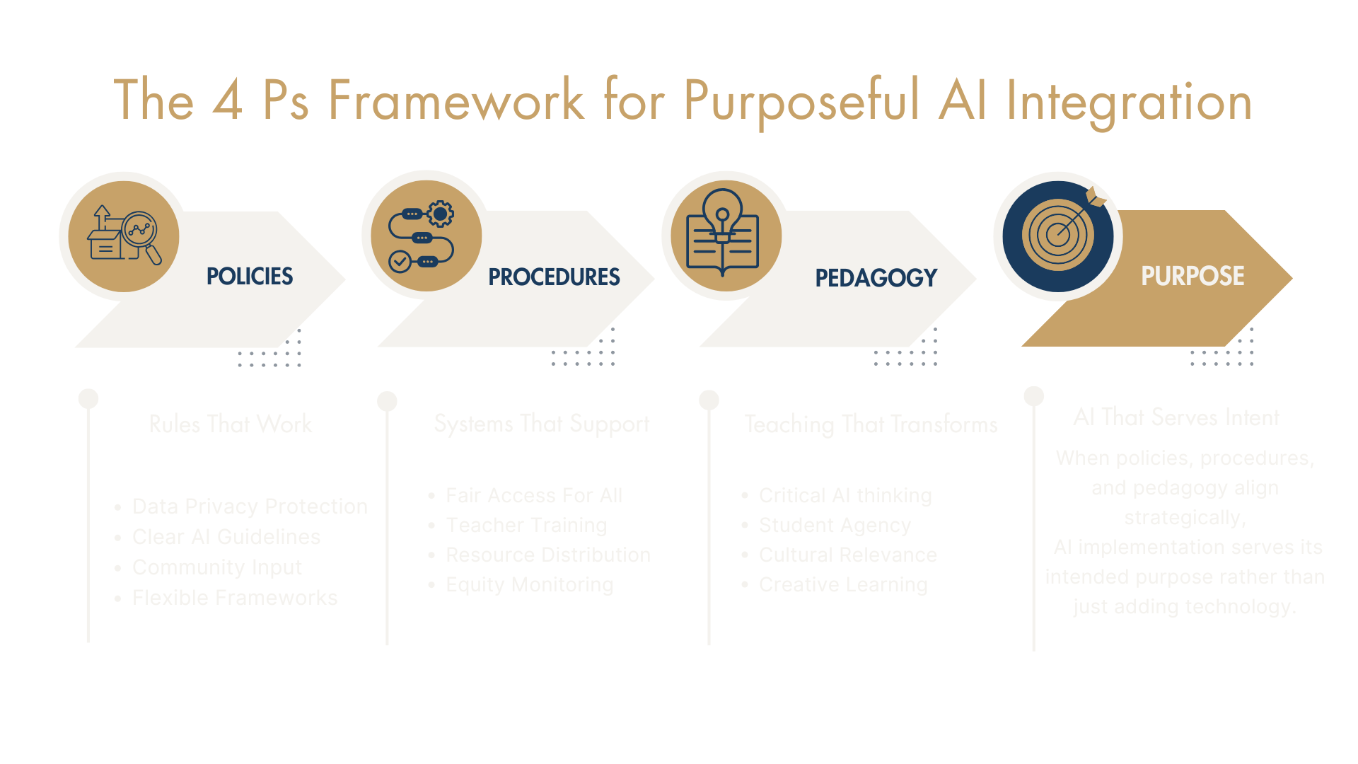 Educational leaders are uniquely positioned to guide thoughtful AI integration that serves all students. Strategic implementation goes beyond selecting tools it requires frameworks for thinking through policies, procedures, and pedagogy systematically.